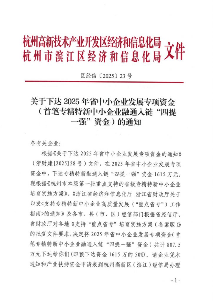 “专精特新”企业是指具备专业化、精细化、特色化、新颖化特征的中小企业,是浙江省重点培育的创新主体。通过“四提一强”专项计划,推动专精特新中小企业深度融入产业链,提升企业核心竞争力,旨在培育一批掌握关键技术的专精特新“小巨人”企业。获得该资金支持,不仅是对企业技术实力和发展潜力的认可,更将为企业在创新技术攻关、智能制造升级等方面提供有力支撑。