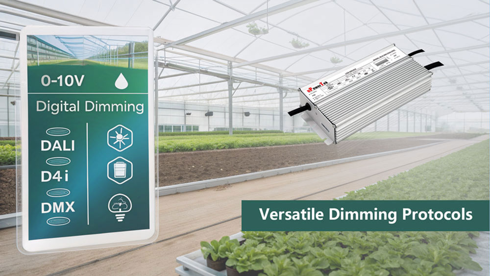 该系列产品整机效率高达 97%,具备 IP68 防水防尘等级,可在高温、高湿等严苛环境中稳定运行,设计寿命长达 10万小时,保障系统长期可靠运行。同时,产品采用先进调光算法,实现全程无频闪、无余晖(dim-to-off),提升光环境稳定性,保护植物正常生长节律。